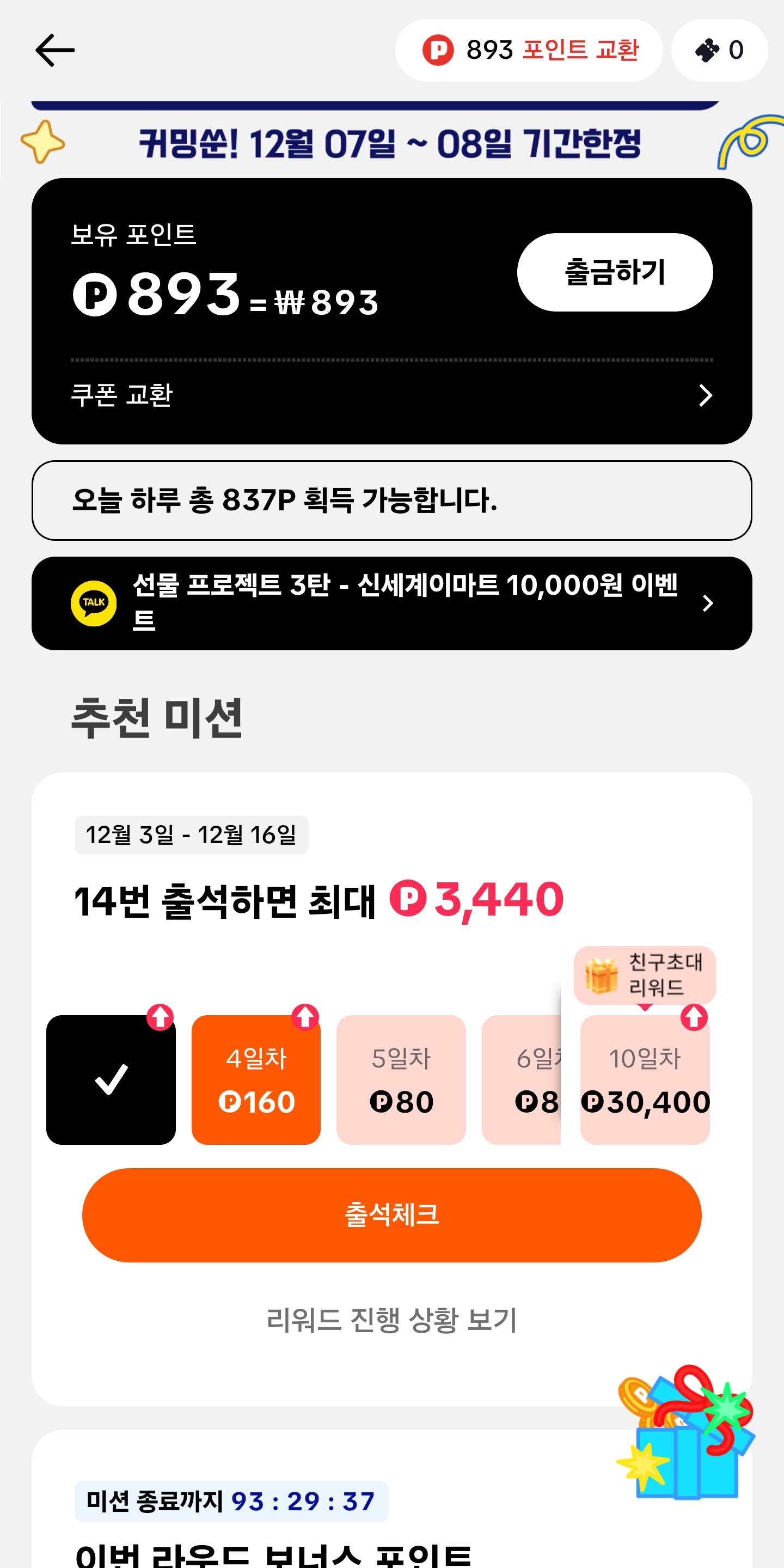 ✅ 친구 초대 이벤트와 출석체크 미션으로 적립금을 받을 수 있어요.